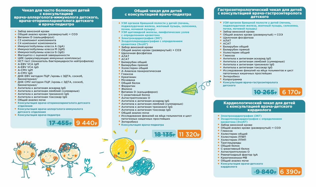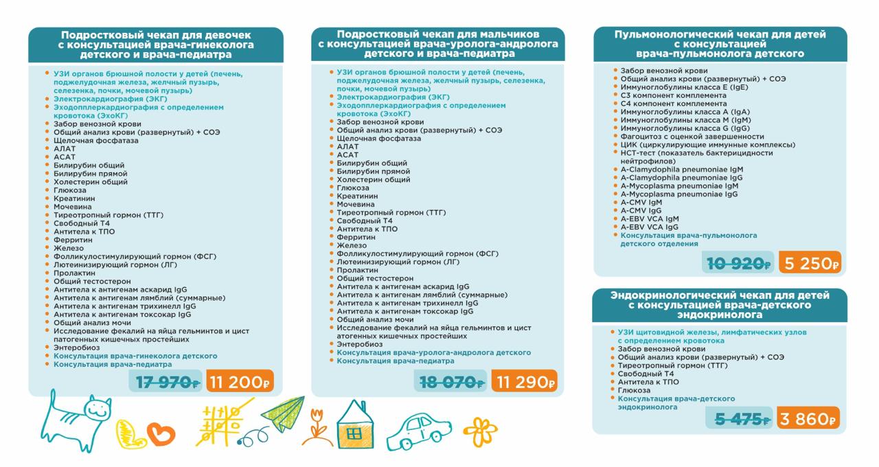 В Детском «Евромеде» в настоящее время организованы чекап-программы по восьми направлениям. Состав и стоимость* представлены на картинках.