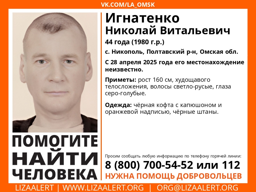 В Омской области объявлен поиск 44-летнего Николая Игнатенко, который пропал 28 апреля 2025 года. Последнее известное место его проживания – село Никополь в Полтавском районе. Об этом сообщили в паблике «Поисковый отряд «ЛизаАлерт» Омской области в соцсети «ВКонтакте».