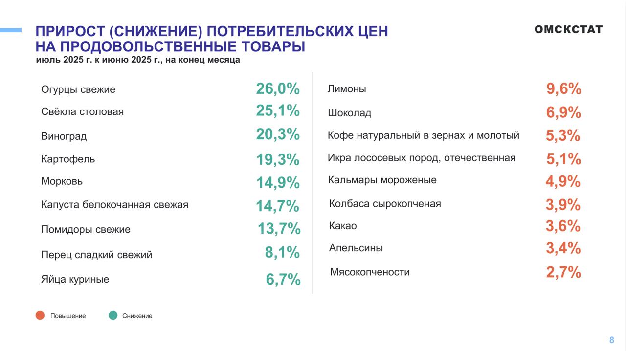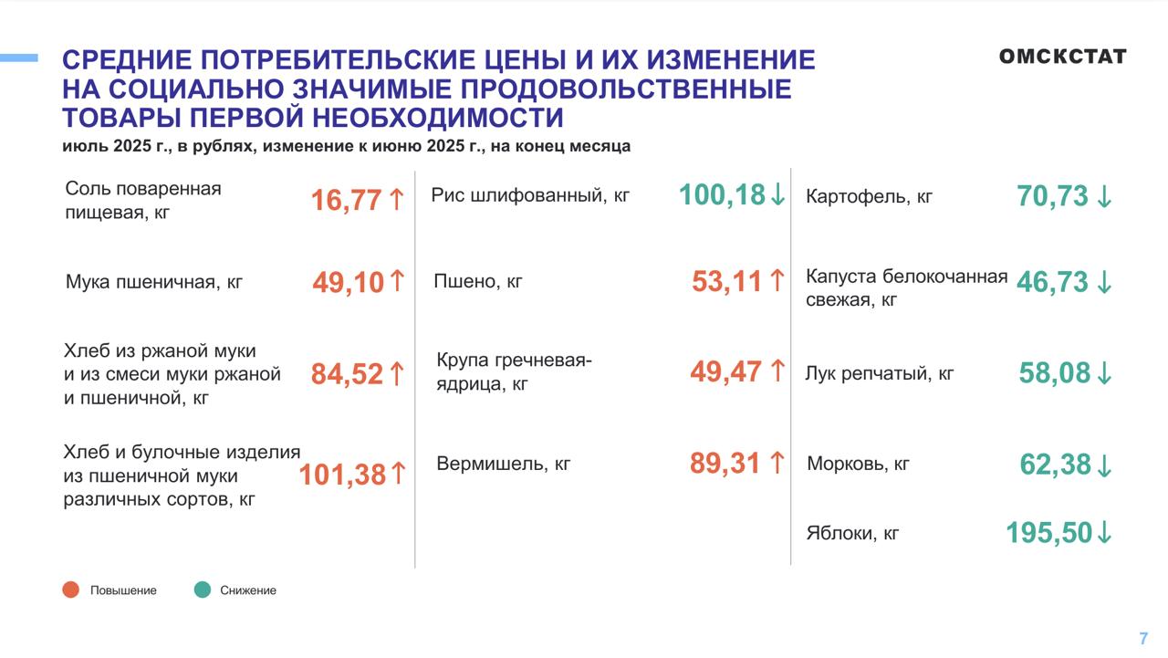 По данным Омскстата, в июле 2025 года потребительские цены в регионе выросли в среднем на 0,3 % по сравнению с июнем. Наибольший рост зафиксирован в сегменте услуг (2,2 %) и непродовольственных товаров (0,2 %), тогда как продовольственные товары в целом подешевели на 0,9 %.