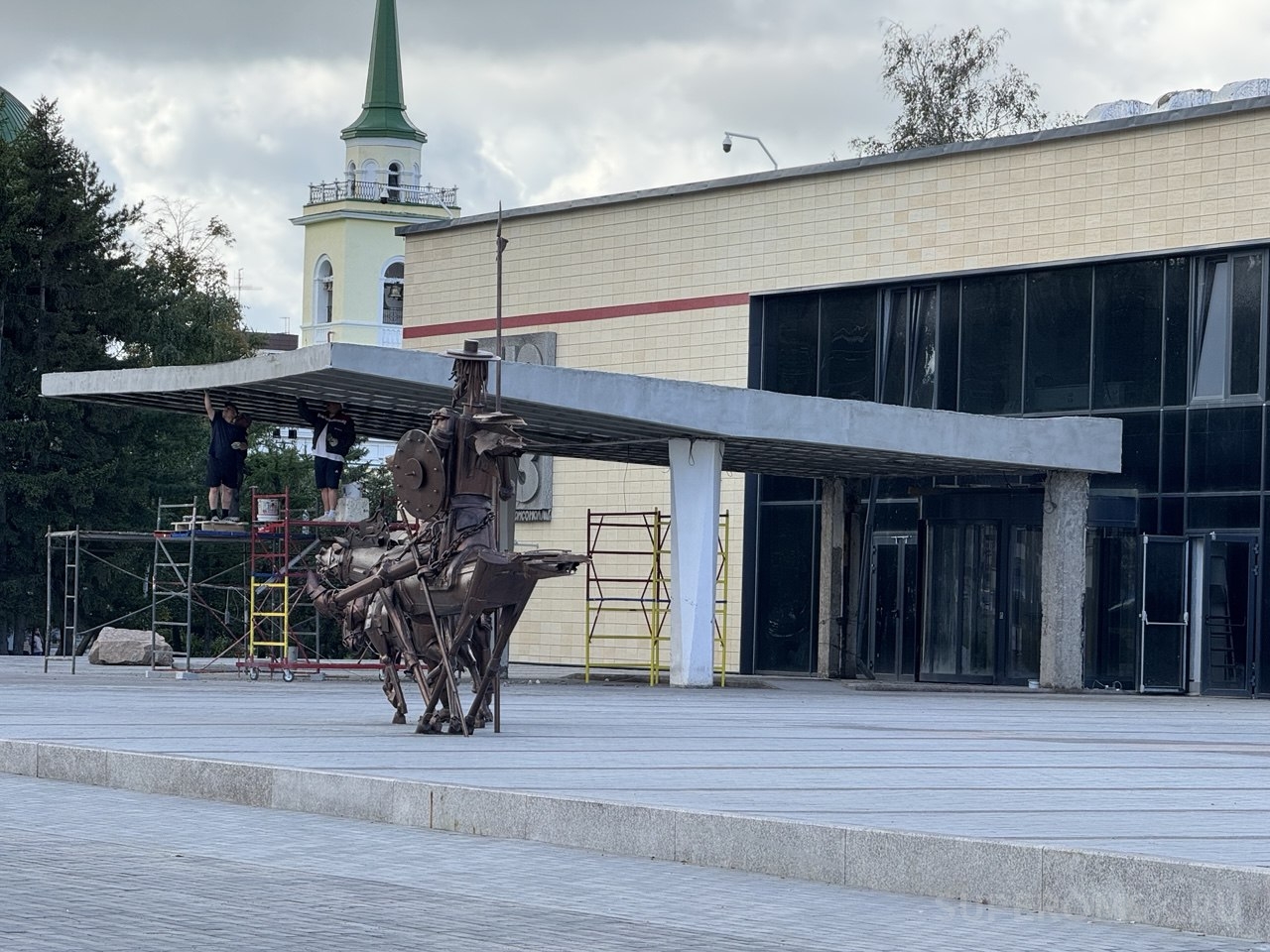«СуперОмск» обратил внимание, что к дате открытия театра рабочие занялись обустройством козырька перед зданием.