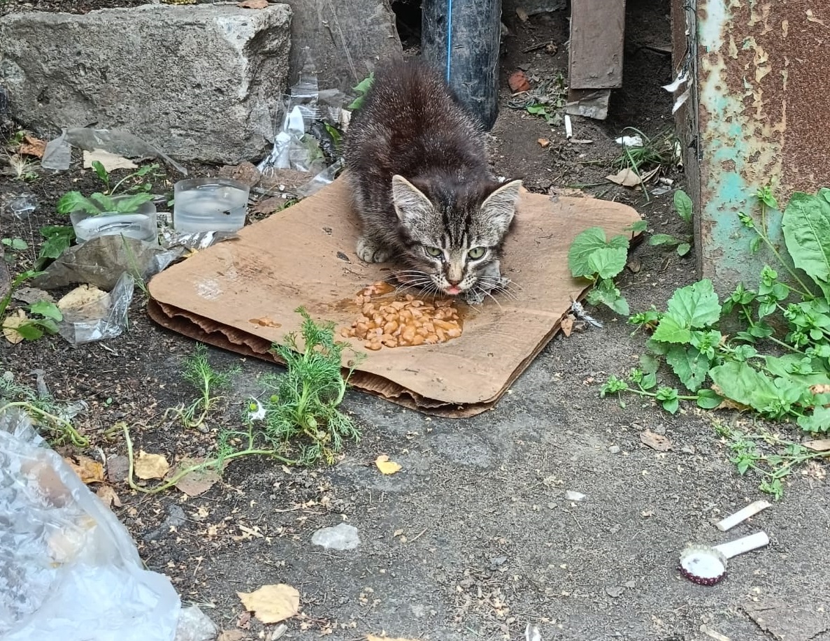 Котенок оказался совсем один – без матери, братьев и сестер, наедине со страхом. Он прибился к мусорке у алкомаркета, где нет даже объедков. Здесь выбрасывают лишь бутылки из-под спиртного и окурки. В столь юном возрасте котенок усвоил – выживает сильнейший, поэтому борется изо всех сил. Подлизывает что-то с асфальта, прячется при виде людей, уворачивается от проезжающих машин и проходящих собак. Он один в этом огромном мире, в котором для него нет любви, заботы и защиты.