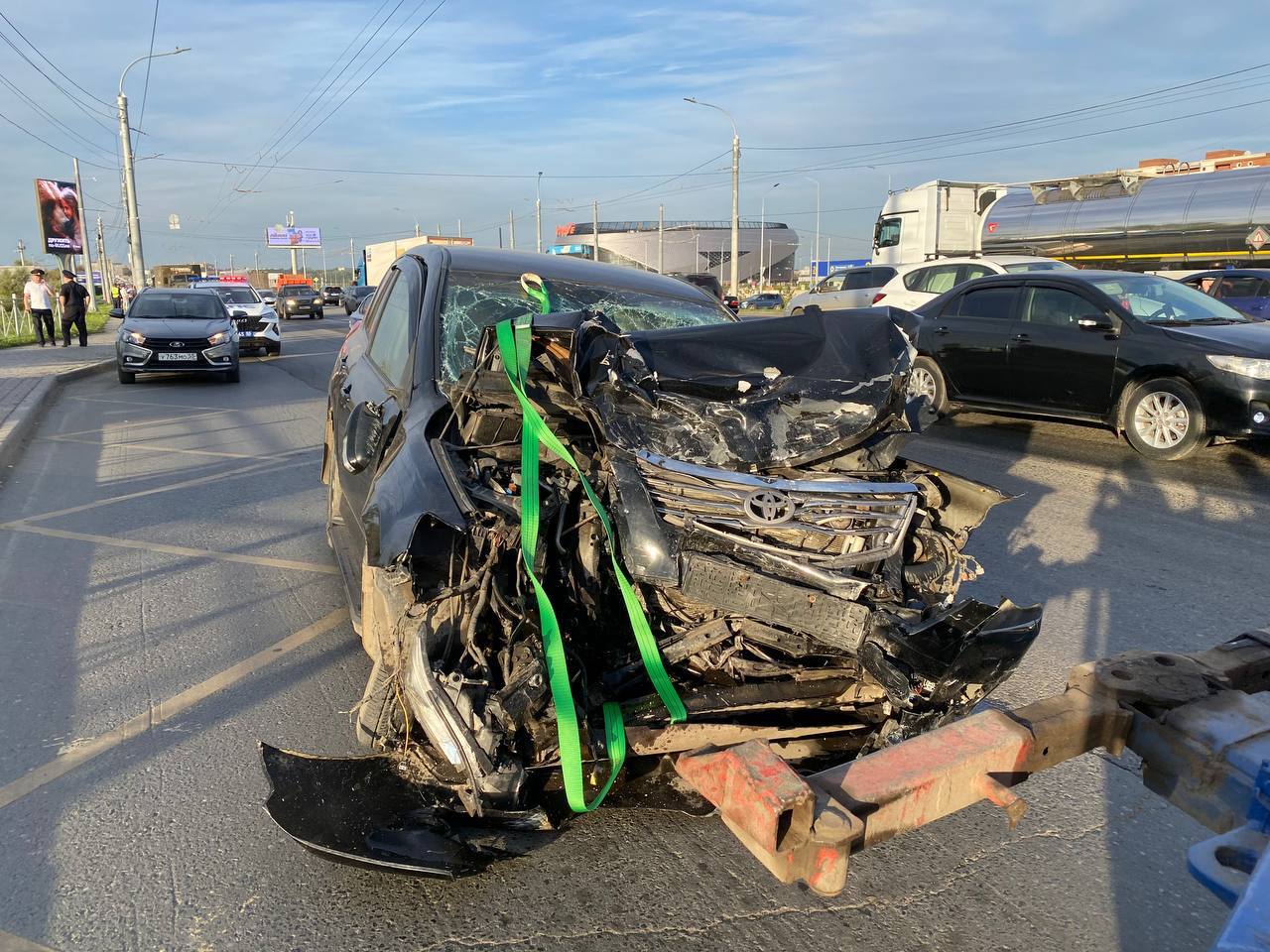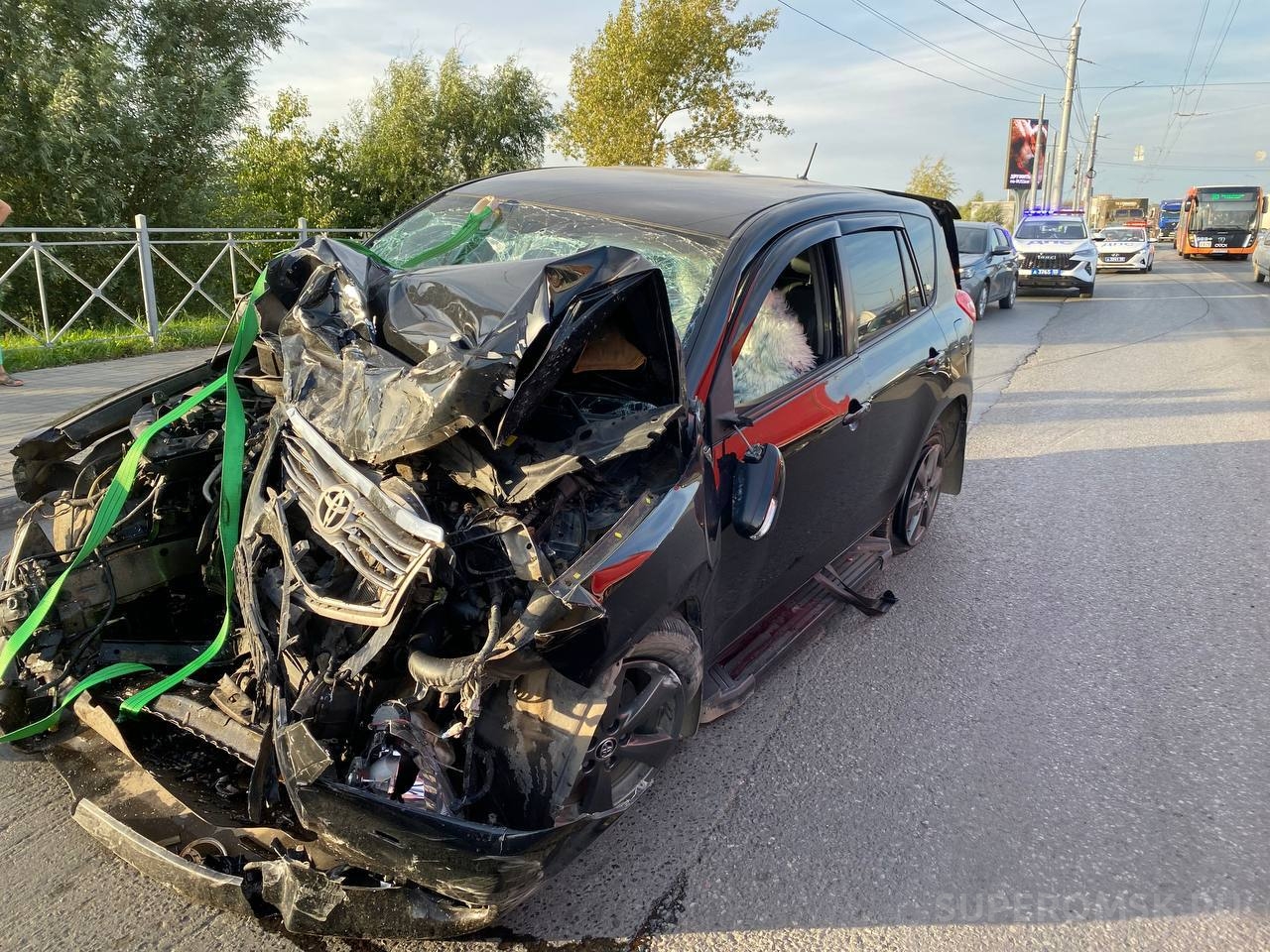 Как видно на кадрах в места происшествия, один из участников столкновения – автомобиль «Тойота» - оказался очень сильно разбит. Также видно повреждения на передней части.