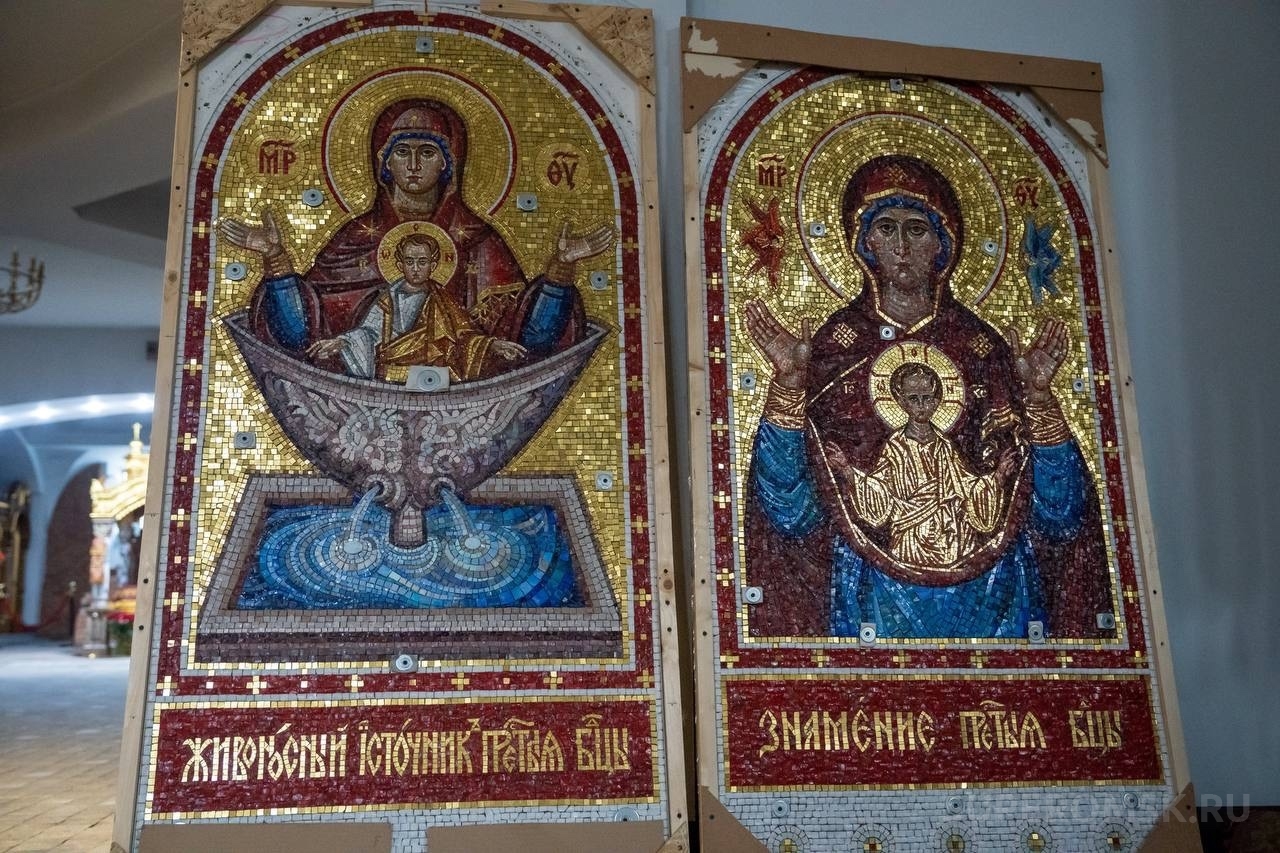 Как добавили в соборе, постепенно вместе с обновлением фасадов будут меняться и пришедшие в ветхость священные изображения, изготовленные почти 20 лет назад на керамических плитках. Они будут заменены новыми мозаичными иконами. Некоторые из них, уже изготовленных мастерами (на фото), прихожане могли видеть в нижнем храме собора.