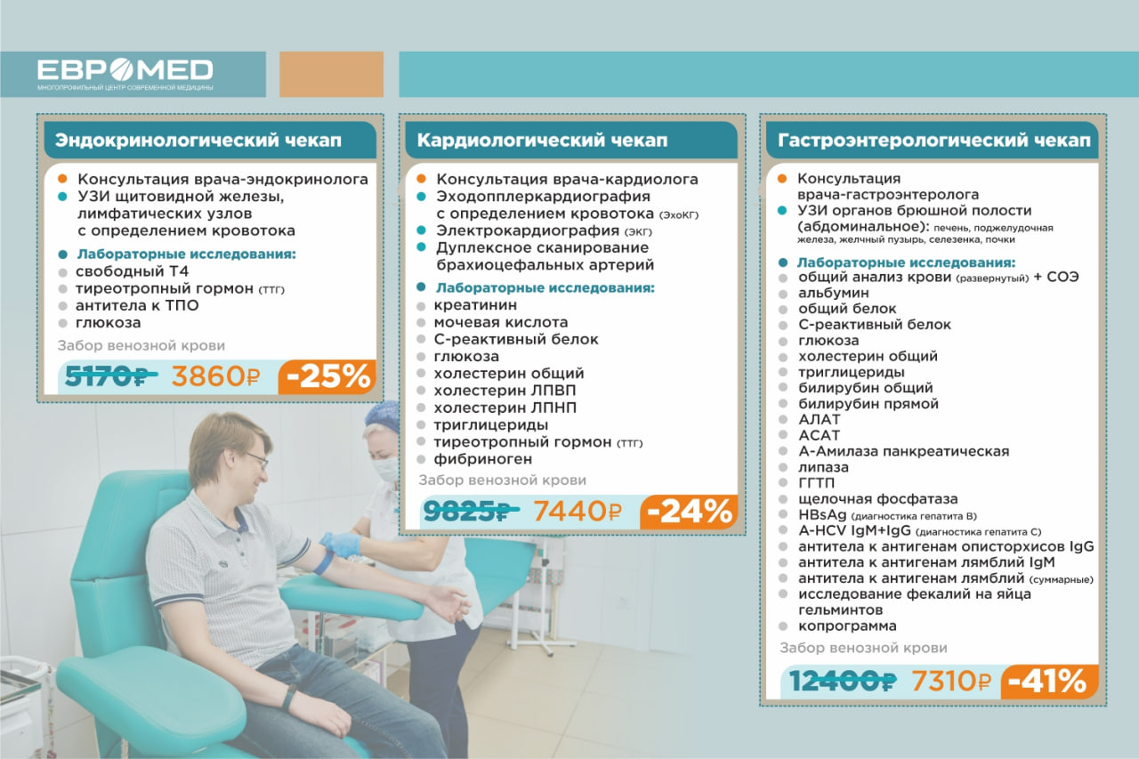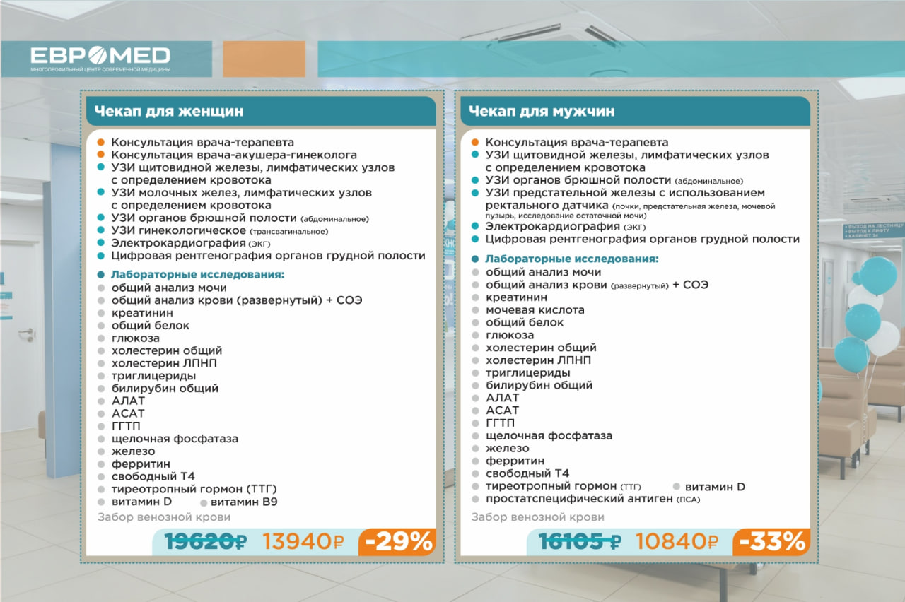 Программы чекап в «Евромеде» позволяют комплексно проверить здоровье в удобное время, короткие сроки и с экономией средств