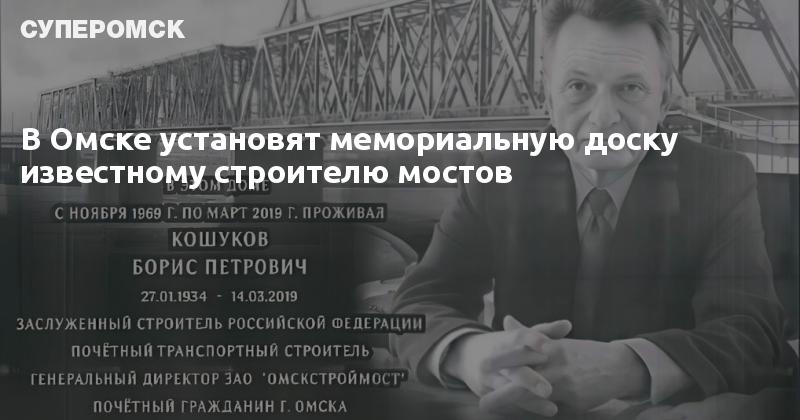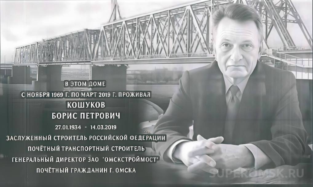 Борис Кошуков – заслуженный строитель РФ, почетный транспортный строитель, почетный дорожник России. Под его руководством предприятие «Омскстроймост – Мостоотряд-63» построило и ввело в эксплуатацию более 100 мостов и путепроводов, десятки тоннелей и подземных переходов, а также 15 причалов.