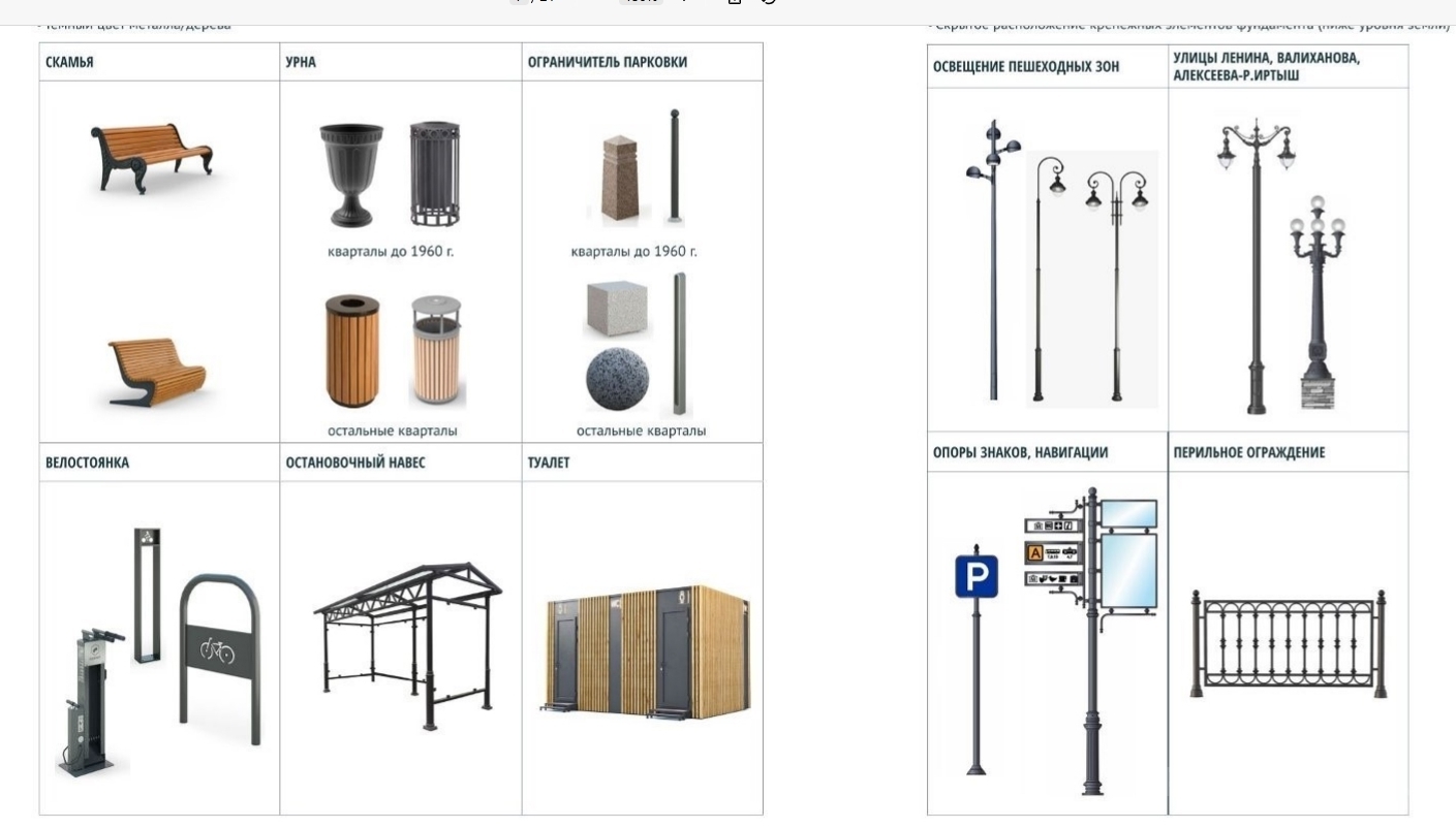 Например, для территорий исторического центра предлагается утвердить в том числе «нейтральную палитру покрытий» для концентрации внимания на архитектурном своеобразии, «прицел» на материалы светлых тонов с ограниченным использованием насыщенного цвета, запрет на использование пешеходных ограждений, на размещение рекламных конструкций в зонах исторических объектов – памятников, зданий, а также визуально перекрывать таковыми панораму города в зоне набережных. Также предполагается установка только прозрачных остановочных павильонов, чтобы не перекрывать виды, установка малых архитектурных форм (скамейки, урны, навесы и т. д.) в стилистике застройки до 1960-х годов (как на фото); применение темного или стального цвета для опор освещения и их минимальное количество.
