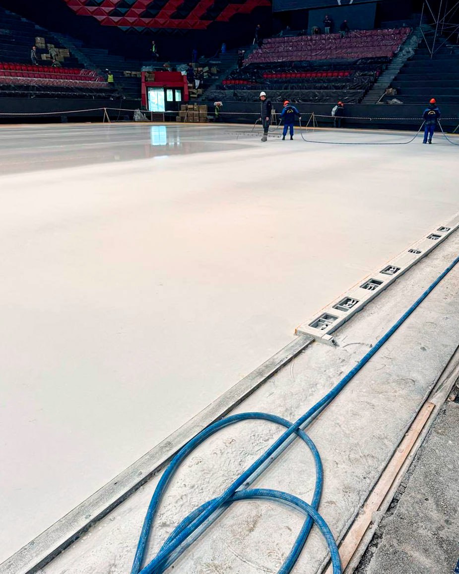На фото: заливка льда в СКК имени Блинова / Источник: телеграм-канал ХК «Авангард»