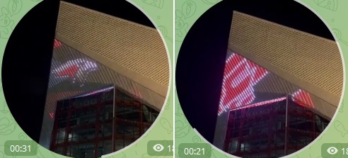 Как видно в «кружке» в телеграм-канале спорткомплекса, цветная подсветка на здании преобразуется в современный логотип «Авангарда» с головой ястреба, а затем – в старый логотип.