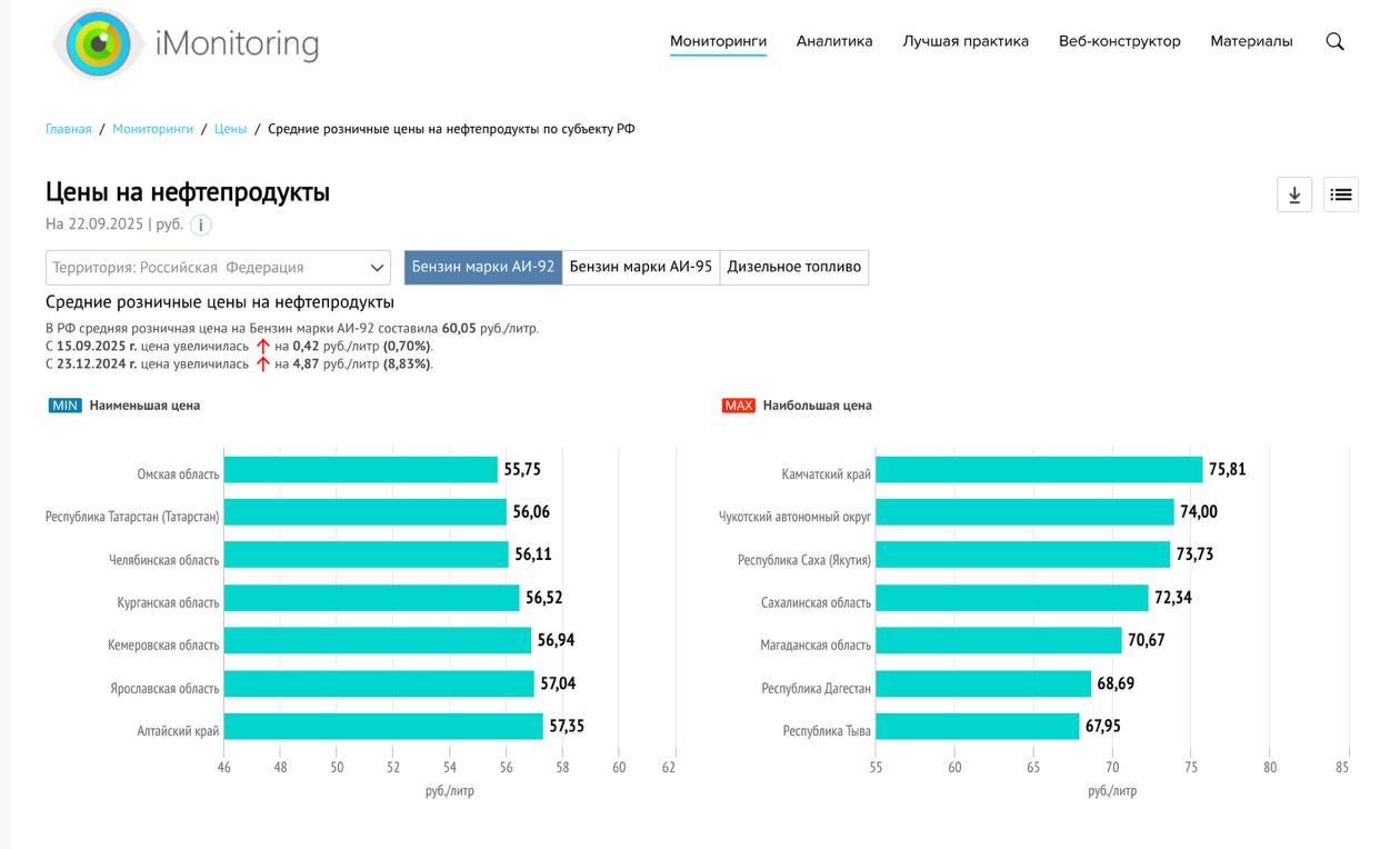 По наблюдениям «СуперОмска», основанным на данных сервиса «Ай мониторинг», стоимость бензина в Омской области оказалась самой низкой в стране. Такой вывод можно сделать на основании средних цен, актуальных на 22 сентября 2025 года.