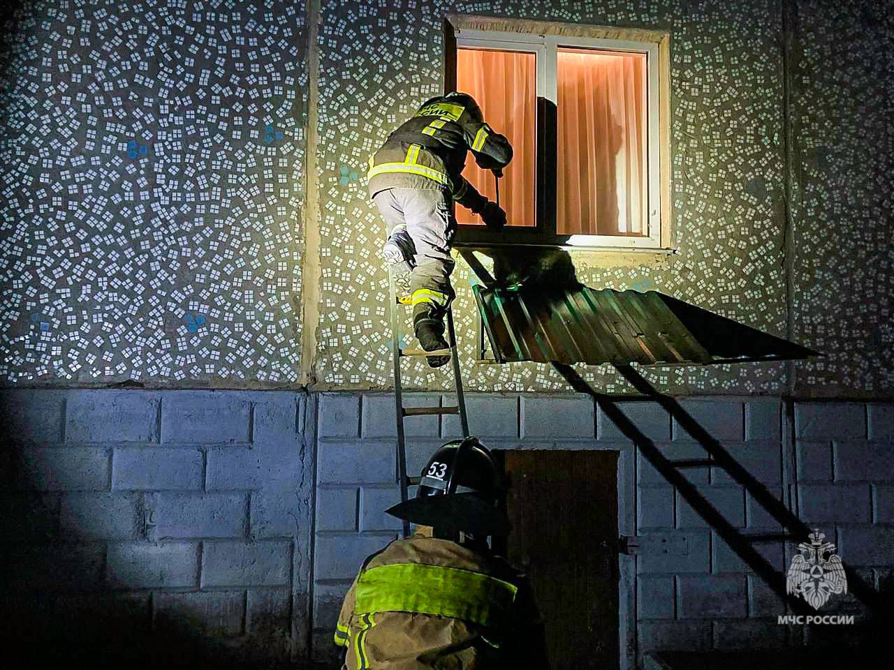 На фото: пожарные при помощи лестницы проникли в квартиру с запертым ребенком внутри / ГУ МЧС по Омской области