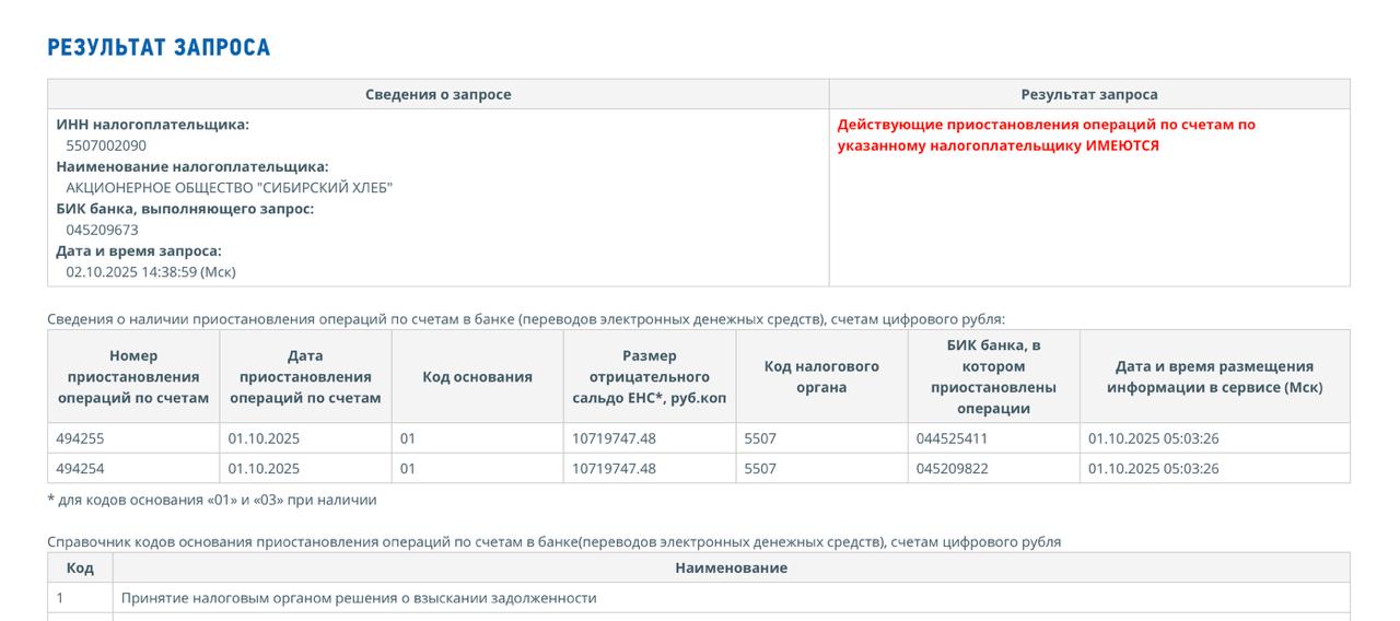 По информации «СуперОмска», основанной на данных выписки из ФНС, в среду, 1 октября 2025 года, приостановлены операции по ряду счетов омского АО «Сибирский хлеб». По мнению фискалов, у производителя хлеба сложилось отрицательное сальдо более чем в 10,7 миллиона рублей. Отмечается, что такие меры приняты на фоне «принятия налоговым органом решения о взыскании задолженности».