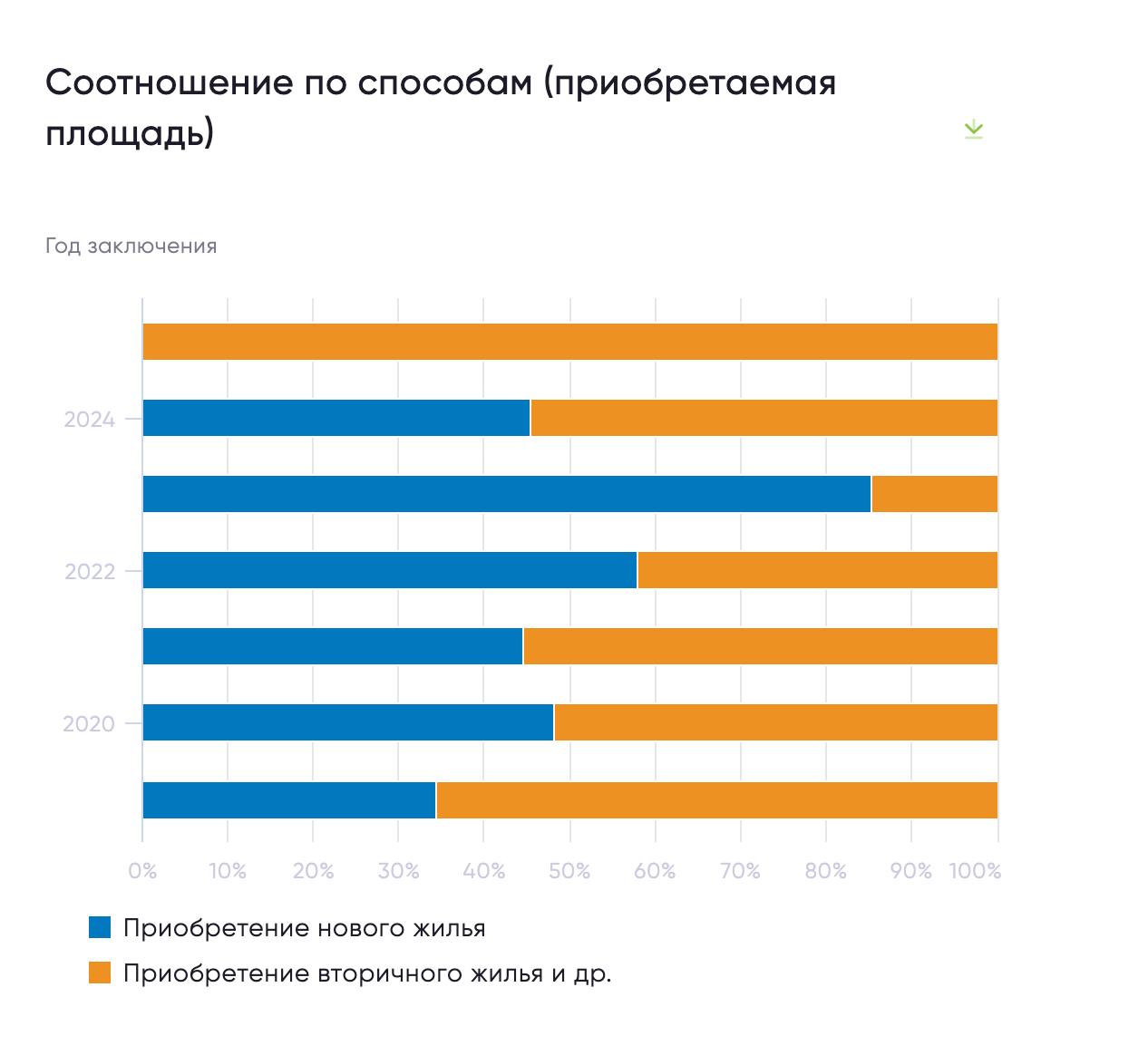 При этом процент вторичного жилья год от года растет. В 2023 году «вторички» было 14,56 %, в 2024-м доля выросла до 54,49 %, а в 2025-м составила 100 %.