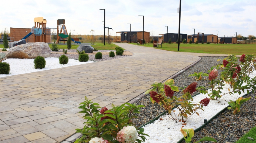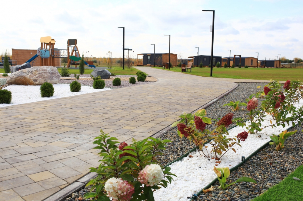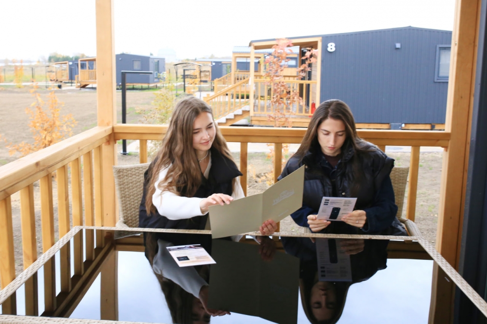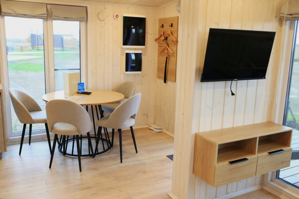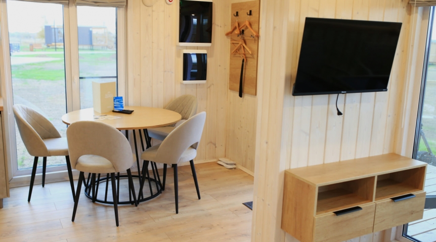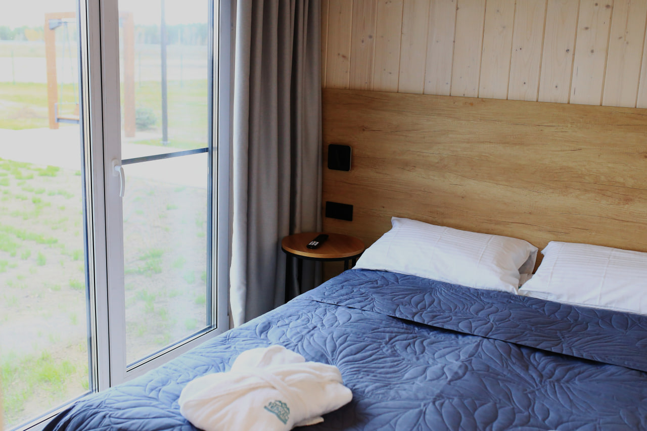 Для проживания здесь предлагают современные экодома: уютные дома с отдельной спальней, гостиной, кухней, террасой и мангальной зоной. Интерьер выполнен в стиле модерн, продуман до мелочей. Внутри есть все необходимое: бытовая техника, посуда, халаты, полотенца, тапочки и гигиенические принадлежности.
