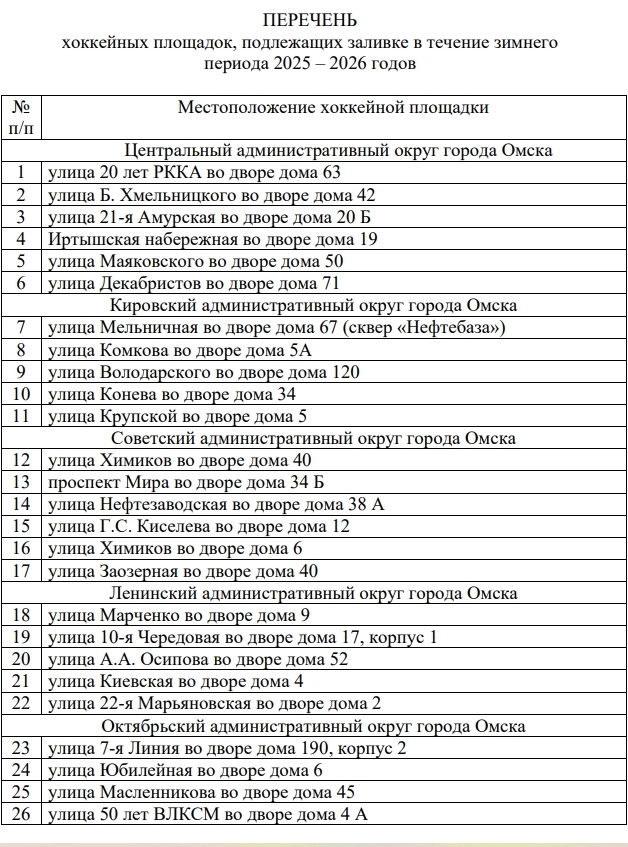 На уровне городской администрации утвердили перечень хоккейных площадок, которые зальют с наступлением зимы в омских дворах. Согласно распоряжению за подписью мэра Сергея Шелеста, обнародованному во вторник, 14 октября 2025 года, в общей сложности «точки» дворового хоккея откроются по 26 адресам.