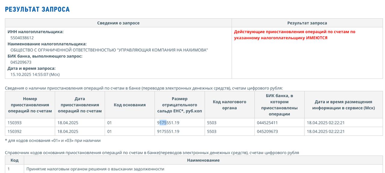 По наблюдениям «СуперОмска», основанным на выписке ФНС, начиная с периода, когда компании присвоен статус банкрота, у нее приостановлены операции по ряду счетов примерно на 9,17 миллиона рублей на фоне задолженности перед налоговой.