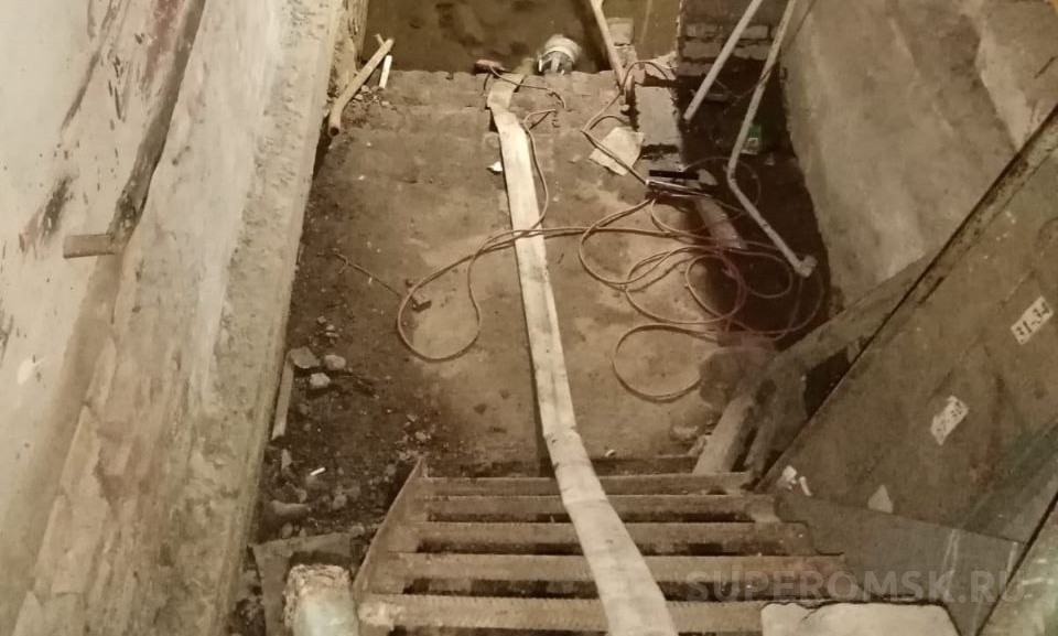 На фото омичи показали подвал, в котором стоит вода и находится шланг, который, вероятно, эту воду должен собрать.