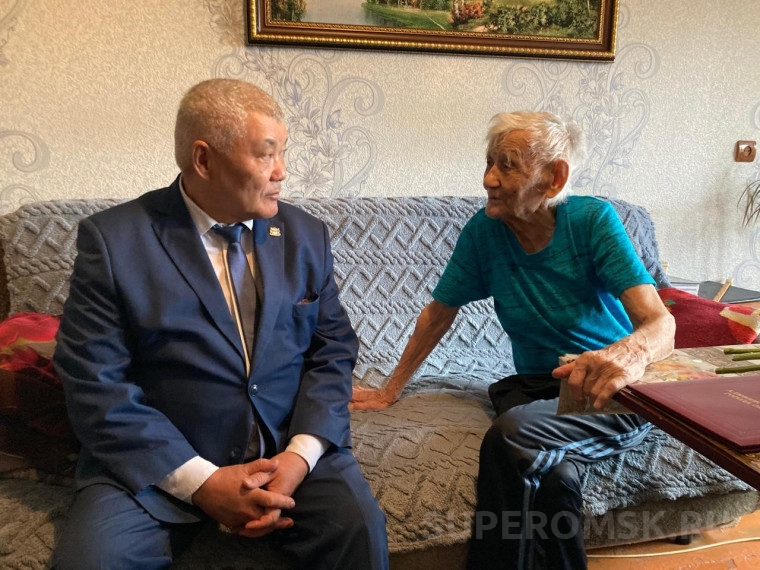 На фото: глава Центрального округа г. Омска Амангельды Мендубаев в гостях у ветерана ВОВ Георгия Хасанова / Источник фото: Администрация г. Омска