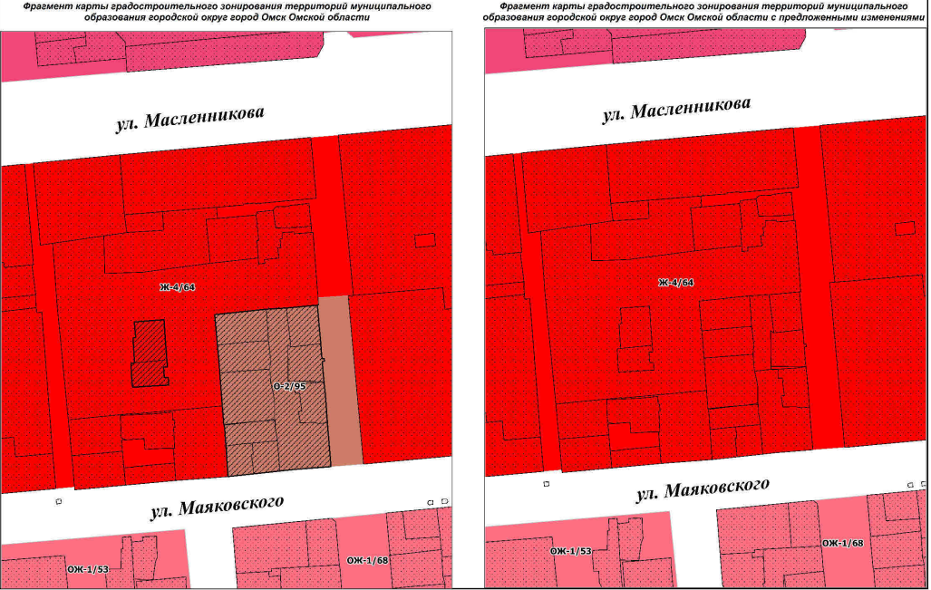 Кроме того, «Карта градостроительного зонирования территорий муниципального образования городской округ город Омск Омской области» теперь выглядит иначе – в новой редакции зоны Ж-4/64 исключили территориальную зону О-2/65, как видно на скриншоте ниже.