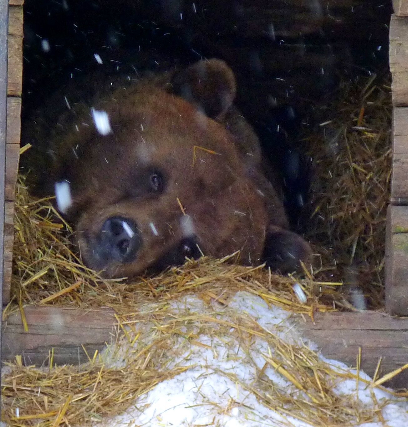 Ноябрьское похолодание и первый снег превратили косолапых обитателей зоопарка в милых лежебок.