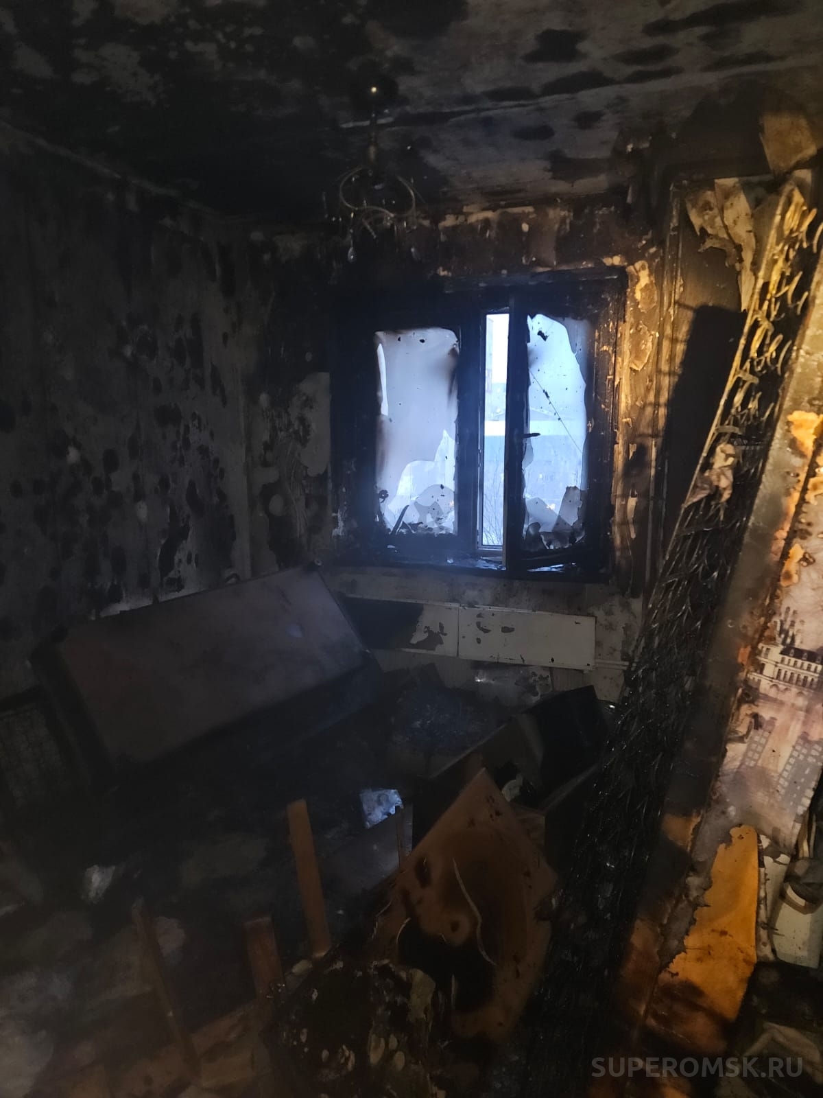 На фото: состояние комнаты после пожара / Источник фото: УМВД России по Омской области