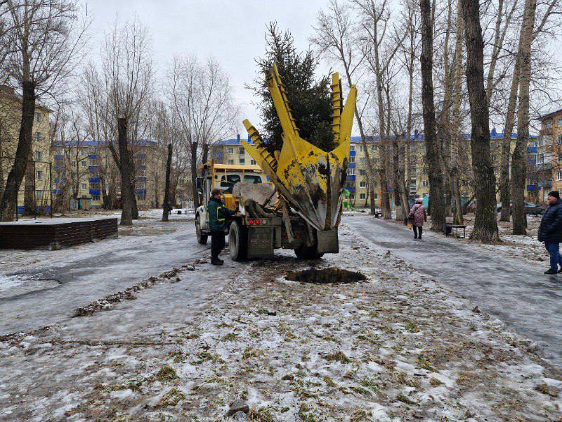 На фото: при помощи спецтехники 6-метровую ель установили в заранее подготовленную лунку / Источник фото: телеграм-канал Сергея Шелеста