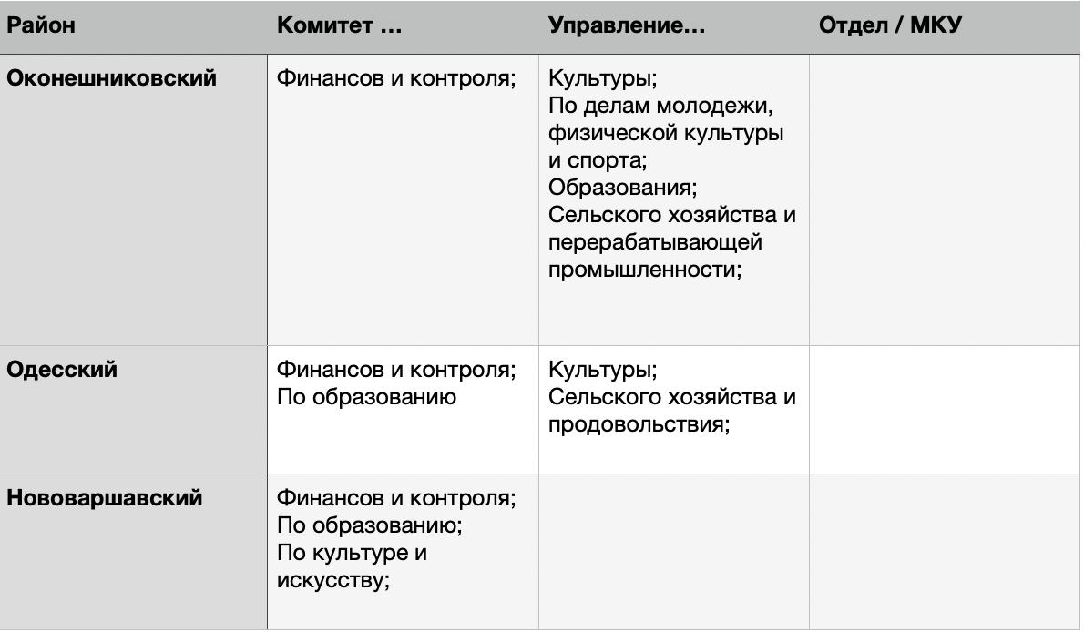 Под структуру управлений большинство районов также отдали сферу сельского хозяйства. В Шербакульском, Тевризском и Исилькульском районах будут созданы управления по вопросам ЖКХ. В Исилькульском, Москаленском, Полтавском, Азовском, Таврическом, Тюкалинском, Оконешниковском и Одесском пожелали создать управления по культуре, в Оконешниковском и Горьковском – по делам молодежи, физической культуры и спорта, а в Азовском и Таврическом – имущественных отношений.