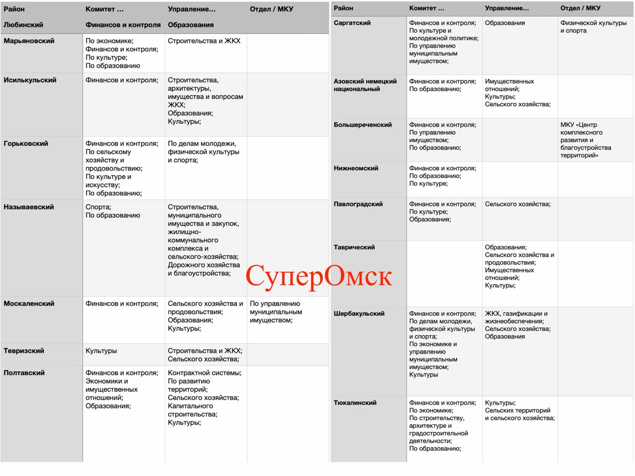 На каких административных единицах сделали выборы районы, можно проследить по их так называемым приоритетам. Так, например, комитет финансов и контроля создан во всех районах именно в такой форме. Вероятно, таким образом более универсально будет выстроено бюджетное взаимодействие администраций с Министерством финансов Омской области.