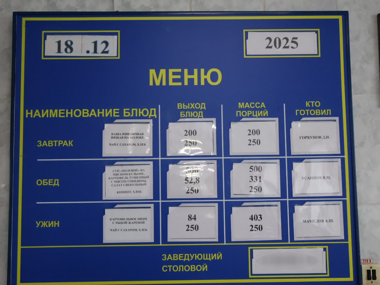 Впрочем, можно довольствоваться и базовым меню для всех. В распоряжении каждого осужденного – трехразовое питание. Например, 18 декабря, судя по информации с меню в столовой, на завтра подавалась каша пшеничная вязкая на молоке, хлеб и чай с сахаром.
