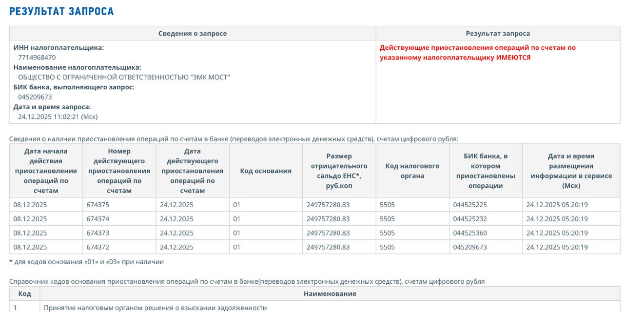 «СуперОмску» стало известно о блокировке счетов ООО «ЗМК Мост». Как следует из ответа налоговых органов на запрос «СуперОмска», основанием для ввода такой меры стало принятое решения о взыскании задолженности по налогам, причем речь идет о сумме свыше 249 миллионов рублей, как можно судить по приведенным ниже данным.