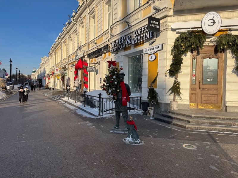 Городовому и псу на улице Ленина надели теплые шарфы. В этом случае украшенное новогоднее дерево установили так, будто страж порядка держит его в руке.