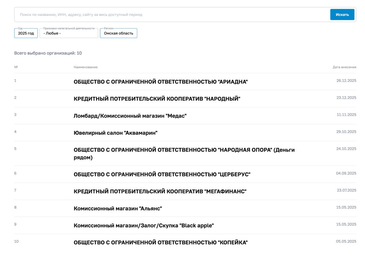 Как обратил внимание «СуперОмск», в пятницу, 26 декабря 2025 года, Банк России внес ООО «Ариадна» в список компаний с выявленными признаками нелегальной деятельности на финансовом рынке. В карточке юрлица говорится, что у омской фирмы установлены «признаки нелегального кредитора».