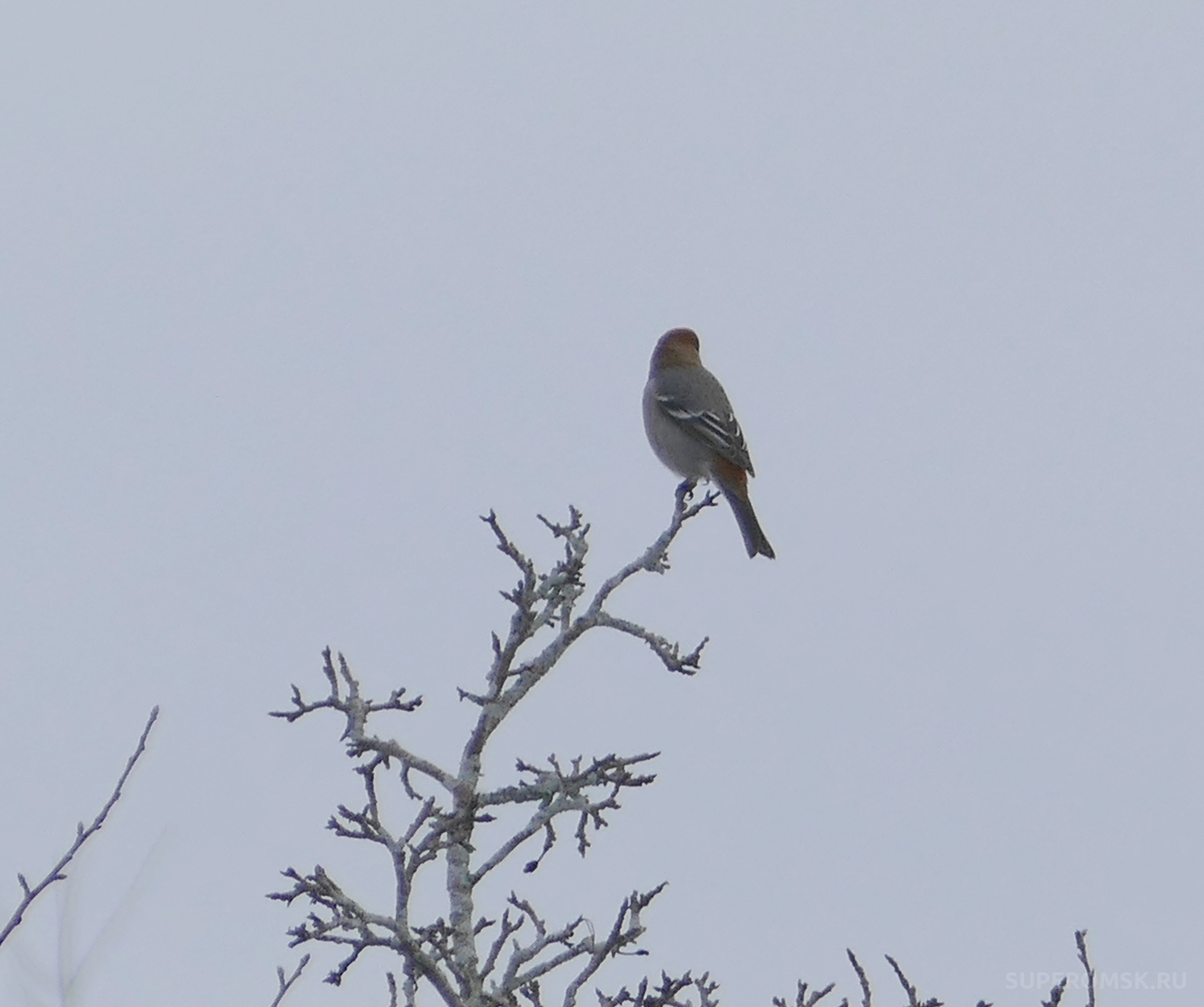 «Обыкновенный щур (Pinicola enucleator). Зимний период проводит в кочевках. Отмечается в местах, где есть хотя бы единичные ели, пихты, лиственницы. Преимущественно древесная птица на землю спускается редко. Питается семенами хвойных и лиственных пород (включая кедровые орешки), ягодами, почками, бутонами», – сообщается в группе «Птичьей гавани» в соцсети «ВКонтакте».