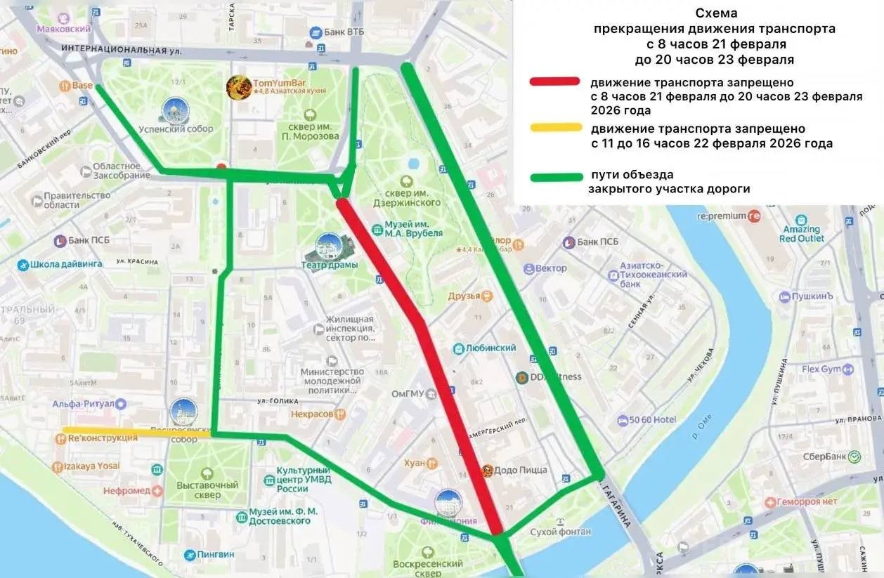Также движение транспорта будет прекращено в воскресенье, 22 февраля, с 11 до 16 часов по улице Партизанской на участке от Спартаковской до АУ города Омска «Музей-исторический парк «Омская крепость» (улица Партизанская, дом 5а).