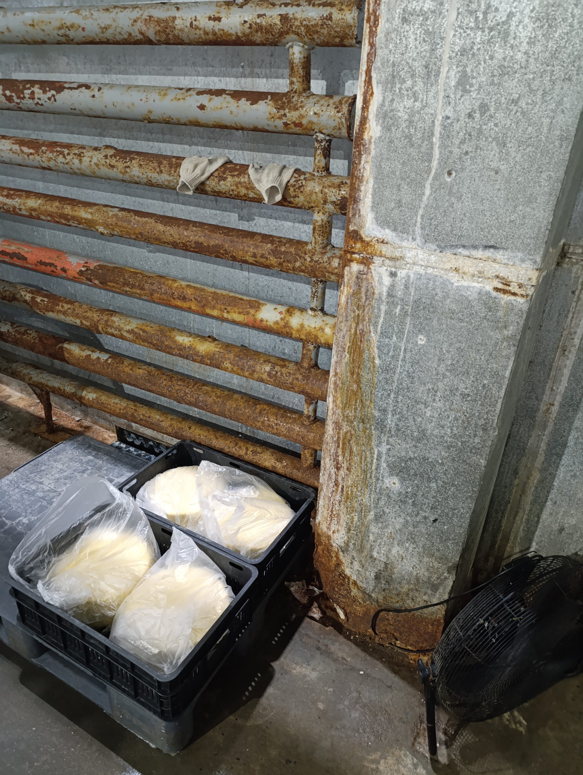 Как видно на фотографии, эти условия совсем не напоминают пищевое производство: ржавчина, потеки и сиротливо висящие перчатки рядом с молочной продукцией.