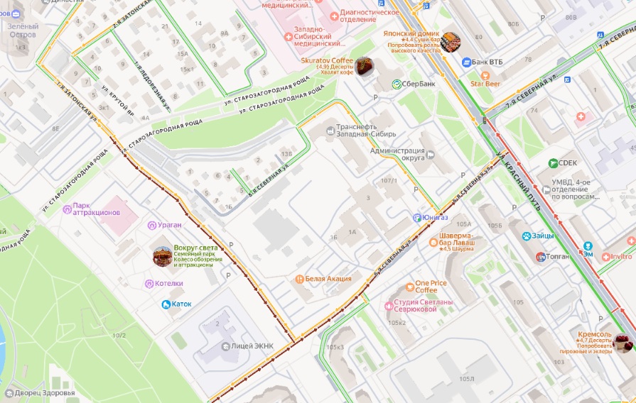 На карте видно, что заторы наблюдаются на Красном пути, а также улицах 6-я Северная, 1-я Затонская и Березовая, которые расположены рядом с «Зеленым островом».