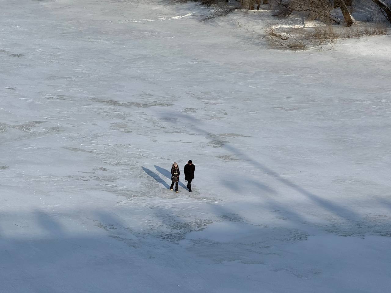 В пятницу, 27 февраля 2026 года, в Омске молодого человека и девушку заметили во время весьма опасной, по мнению автора, прогулки. Они выбрались на середину реки Омь и направились по течению в сторону Иртыша прямо по льду.