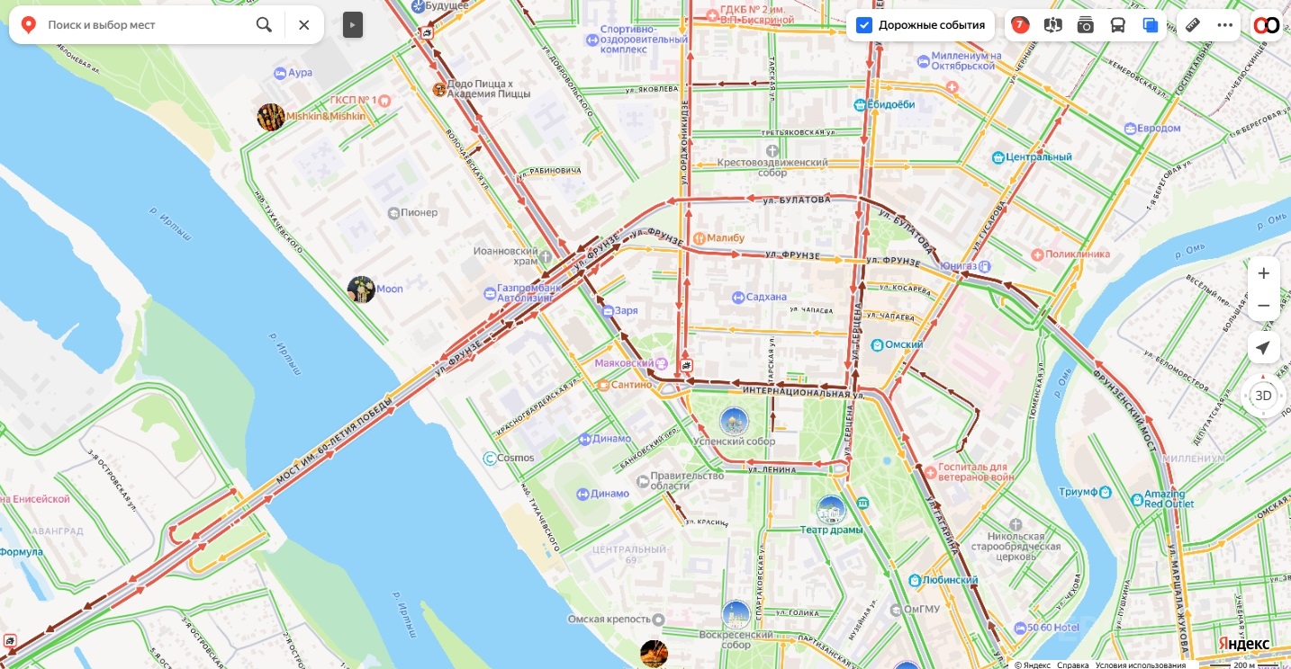 Так, по данным сервиса «Яндекс.Пробки», в большом заторе в обе стороны стоят водители на метромосту, а также на съезде по улице Фрунзе. При этом зафиксированы ДТП при съезде на Левый берег.
