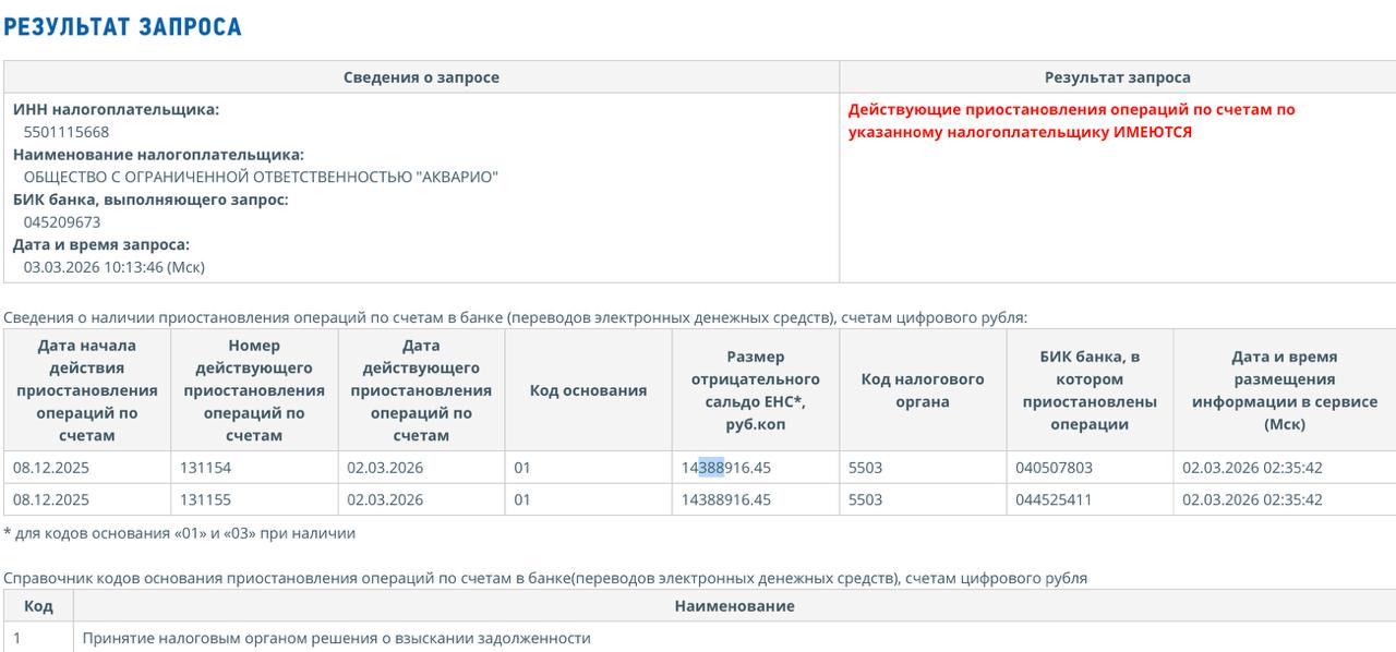 По состоянию на начало марта 2026 года действует блокировка счетов компании при отрицательном сальдо свыше 14,388 миллиона рублей. Согласно полученному ответу «СуперОмска», в обоснование этих мер приводится формулировка «принятое налоговым органом решение о взыскании задолженности».