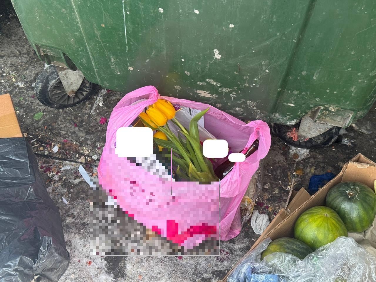На площадке для сбора мусора в центре города обнаружен букет тюльпанов.