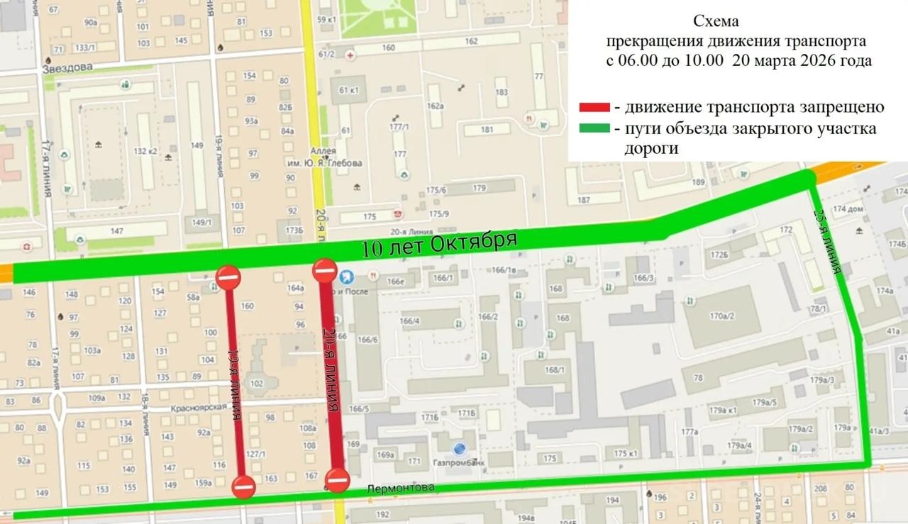 По данным городской администрации, проезд по улицам 19-я и 20-я линия на участке от улицы Лермонтова до улицы 10 лет Октября будет закрыт в пятницу, 20 марта 2026 года, с 6 часов до 10 часов.