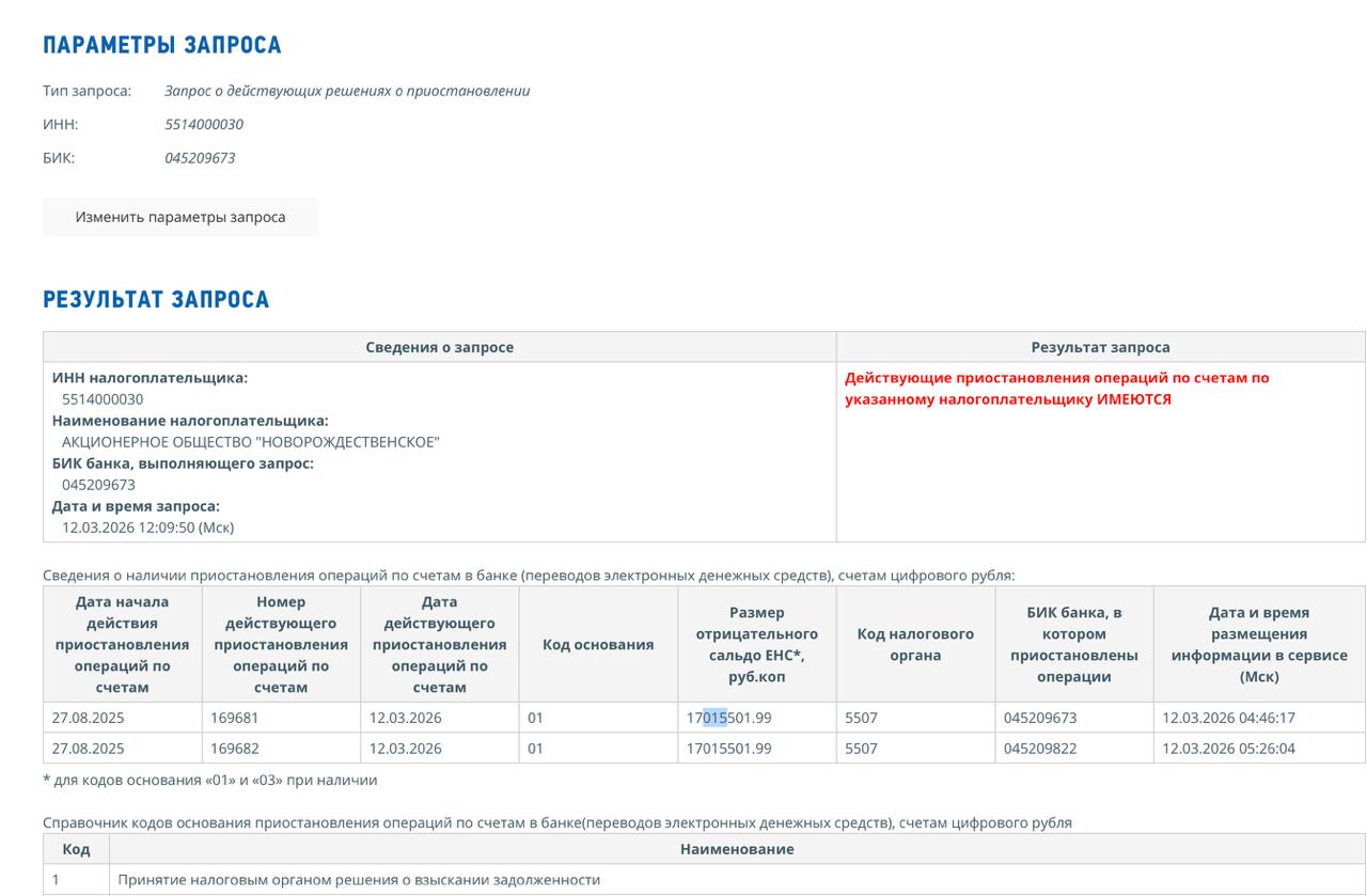Отметим, это не единственное сельхозпредприятие в Омской области с аналогичной ситуацией. В арбитраже рассматриваются банкротые иски в отношении АО «Новорождественское». Предприятие со среднесписочной численностью сотрудников в 169 человек, согласно ОКВЭД, специализируется на разведении крупного рогатого скота и производстве сырого молока. С осени ФНС ввела ограничение операций по счетам АО на сумму 17 млн рублей.