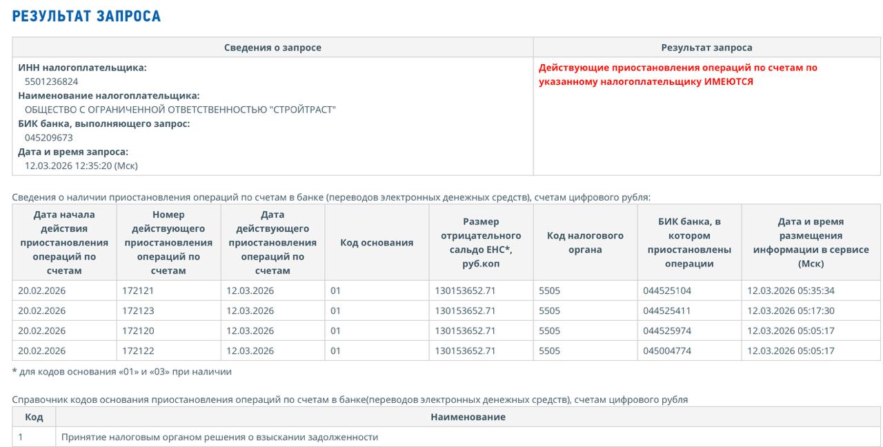 Счета ООО «Стройтраст» заблокированы в четырех банках, операции приостановлены с 20 февраля 2026 года.