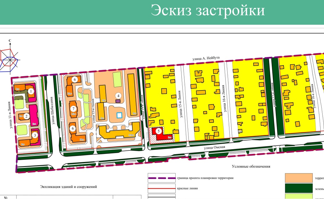 Согласно демонстрационным материалам на сайте городской администрации, изменения планируются на участке, ограниченном улицами Омской, 11-й линией, Шебалдина и 13-й линией, что неподалеку от Горбатого моста, планируется до 2030 года построить шесть высотных домов. На первом этапе к 2028 году собираются возвести десятиэтажки – на углу Омской и Шебалдина и на углу Нейбута и Шебалдина (на схеме объекты обозначены под № 6). Затем, в 2029-м, должна появиться 16-этажка на Шебалдина (№7 на схеме). А уже в 2030 году должны достроить 8-этажные дома (№ 1, 2 и 3 на схеме), в одной из которых разместят детский сад на не менее чем 50 мест.