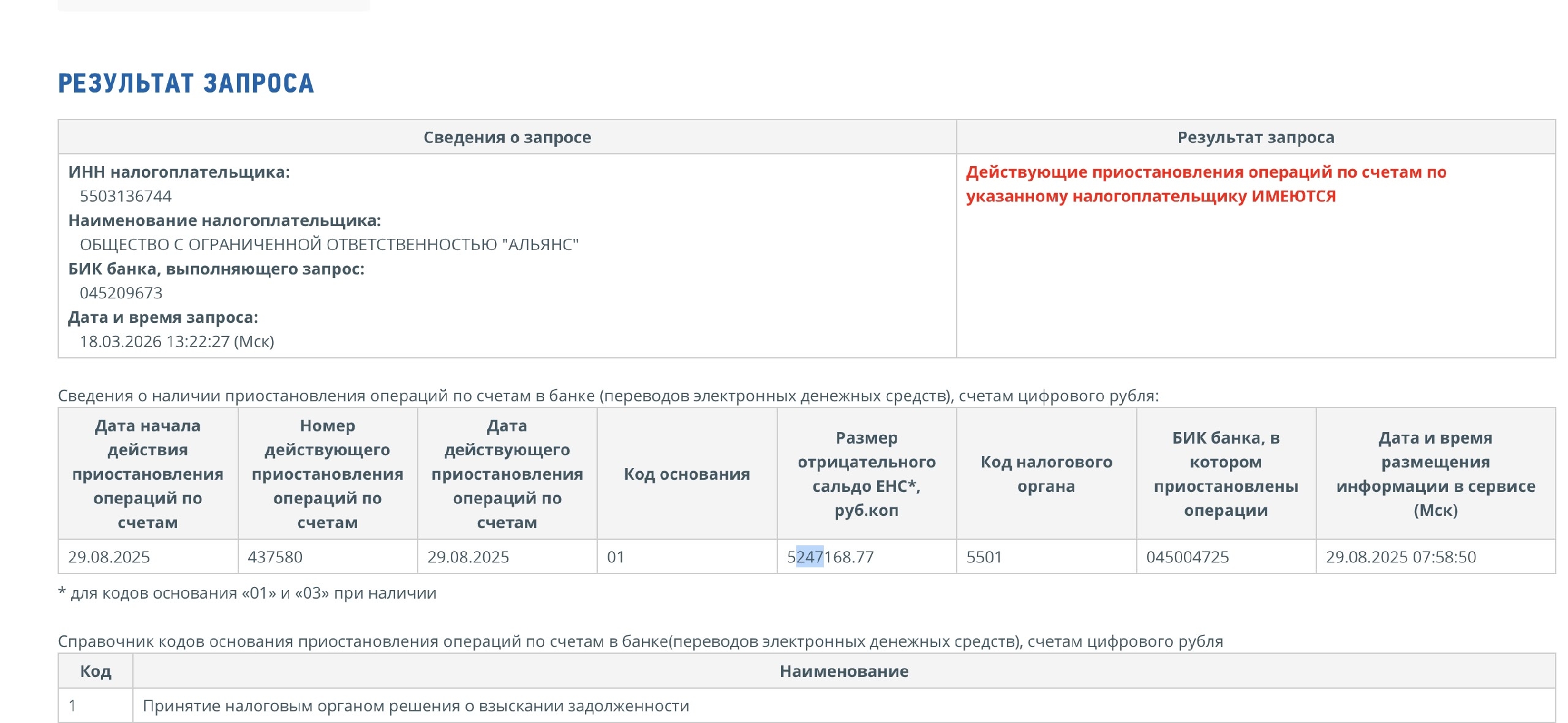 По сведениям «СуперОмска», по состоянию на среду, 18 марта 2026 года, действует блокировка счетов ООО «Альянс» Михаила Медведева. Мера введена на фоне принятия решения о взыскании задолженности со стороны налоговых органов при сложившемся на счетах отрицательном сальдо на сумму свыше 5,24 миллиона рублей.