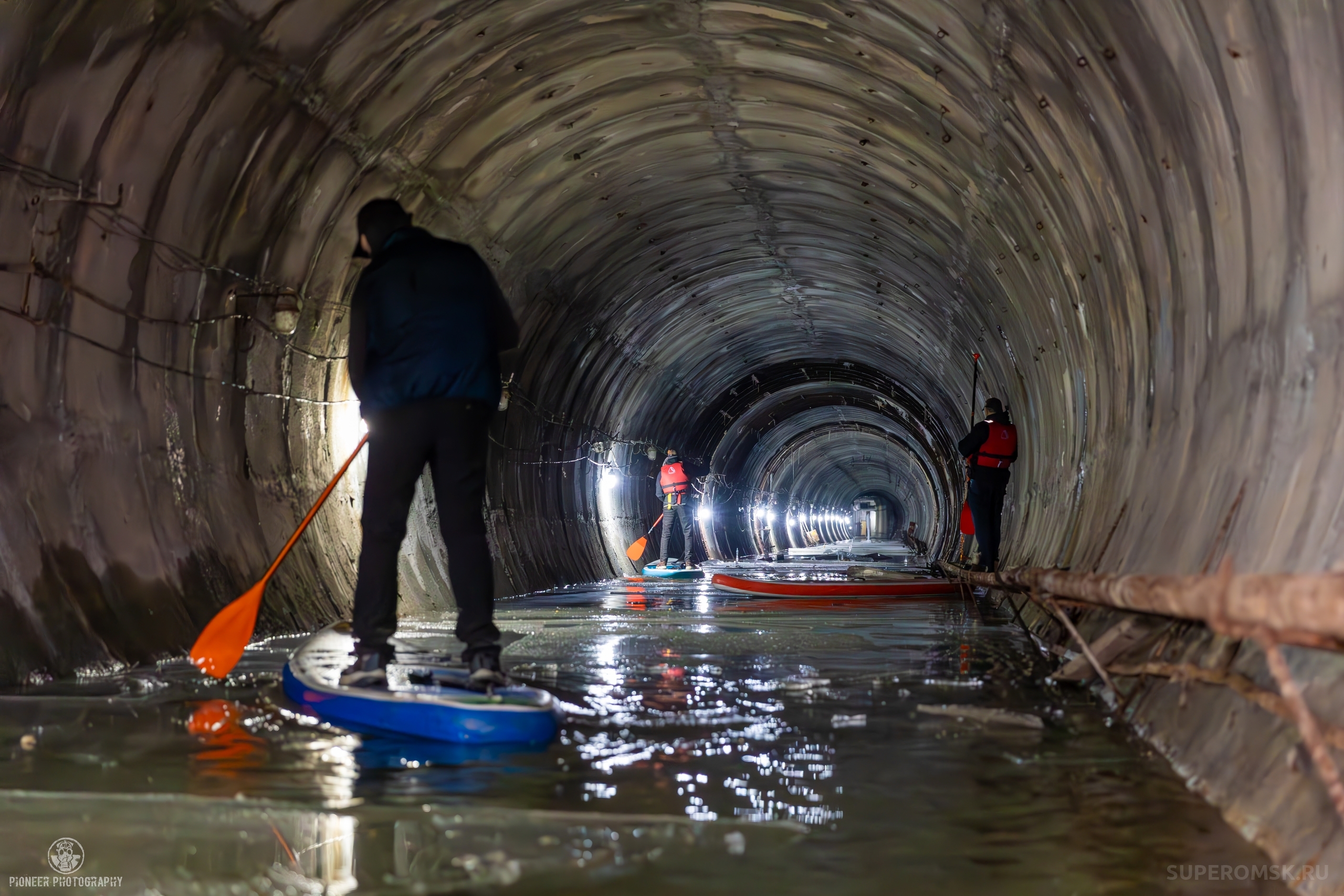 Как узнал «СуперОмск», в конце марта 2026 года группа омичей проникла в недостроенное омское метро. На этот раз любители подземных приключений использовали сапборды – надувные доски для гребли стоя, которые обычно применяют для сплавов по рекам и озерам. Как видно на фотографии, компания свободно разместилась в тоннелях и устроила заплыв по затопленным подземным коммуникациям.