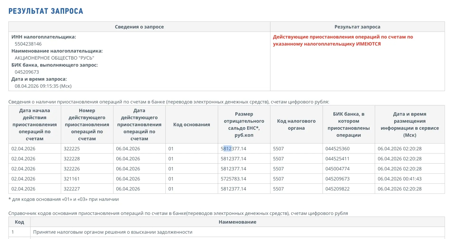 Как стало известно «СуперОмску», по состоянию на среду, 8 апреля 2026 года, объявлена приостановка операций по счетам АО «Русь», на которых сложилось отрицательное сальдо свыше 5,81 миллиона рублей. Мера введена на фоне принятия налоговым органом решения о взыскании задолженности.