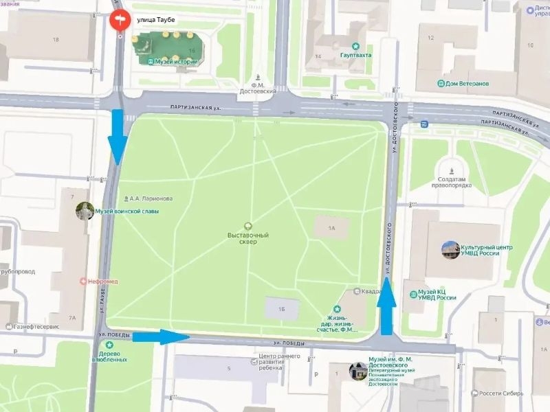 Проезд по улицам Таубе, Победы и Достоевского организуют только в одностороннем режиме, против часовой стрелки, если смотреть на карту этой локации (на фото).