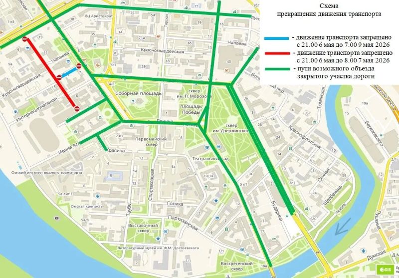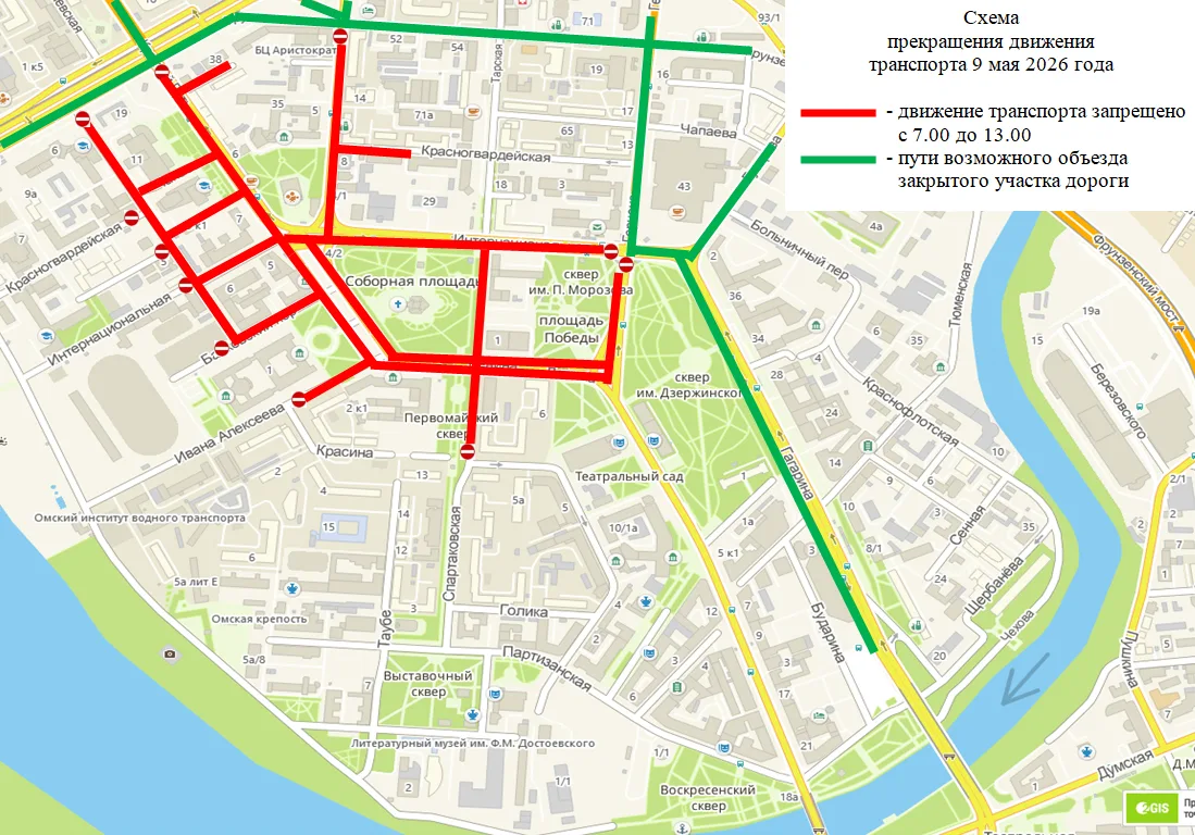 Омичам предлагают объезжать перекрытые участки по улицам Фрунзе, Герцена, Булатова, Гусарова, Партизанская, Щербанева, Гагарина, проспекту К. Маркса.