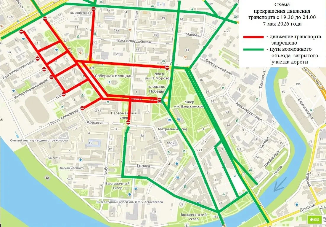 Мэрия Омска сообщила в пятницу, 17 апреля 2026 года, что с 6 по 9 мая в центре города ограничат движение транспорта. Заявляется, что это связано с проведением тренировок и торжественного построения войск Омского гарнизона в честь Дня Победы, а также с организацией других праздничных мероприятий.