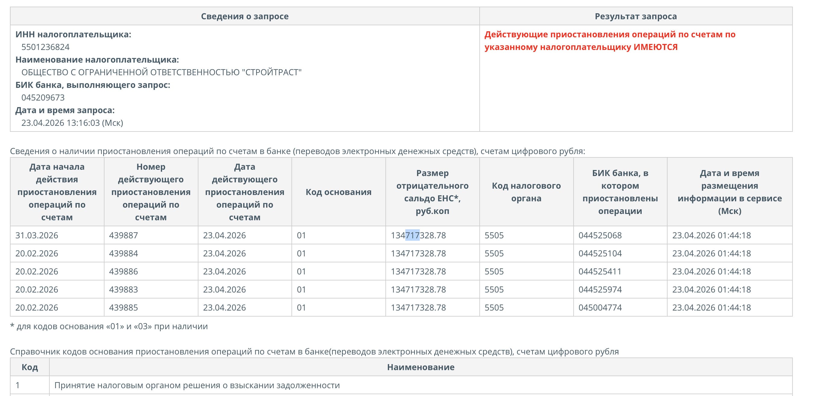 С ответчика требуют около 134 млн рублей. Практически на эту же сумму приостановлены операции по счетам юрлица (на фото ниже).